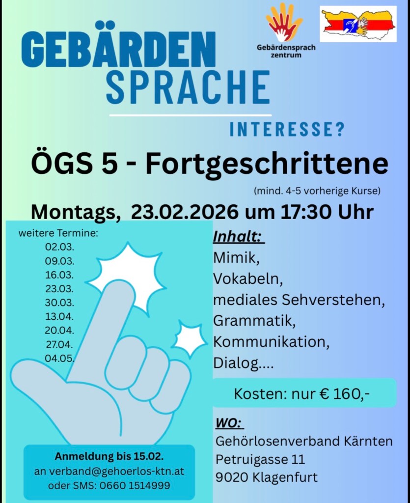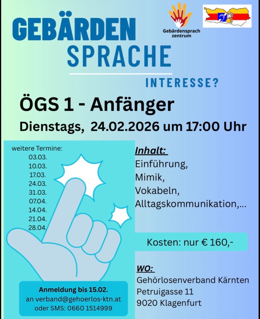 Du bist du stolz auf deine Sprache, die Österreichische Gebärdensprache (ÖGS)? Möchtest du dein Wissen weitergeben und andere inspirieren? Dann ist die Ausbildung zum/zur ÖGS-Kursleiter/in genau das Richtige für dich! Als Kursleiter/in hast du die Möglichkeit: Jetzt informieren und Teil einer starken Gemeinschaft werden! Anmeldung:verband@gehoerlos-ktn.atSMS: 06601514999