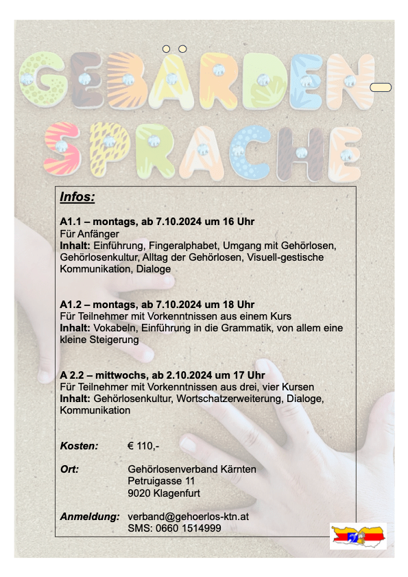Im Herbst starten im Gebärdensprachzentrum wieder unsere beliebten ÖGS Herbstkurse. Angeboten werden Kurse für Anfänger und Fortgeschrittene. Wenn du dir nicht sicher bist, welcher Kurs für dich passt, oder wenn du noch Fragen zu den Inhalten hast, dann melde dich bitte gerne. Nähere Informationen sind dem Anhang zu entnehmen.
