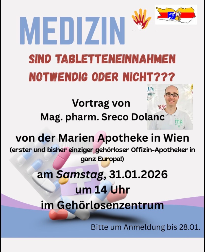 Wann sind Medikamente notwendig? Wie funktioniert die Einnahme richtig? Der erste gehörlose Apotheker Europas, Mag. pharm. Sreco Dolanc, ist aus der Marien Apotheke Wien bei uns zu Besuch und wird uns vieles erklären. Komm vorbei! Screenshot Ähnliche Beiträge